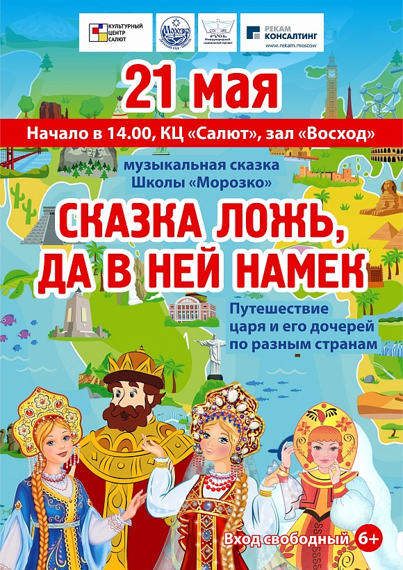 Музыкальная сказка «Сказка ложь да в ней намёк…» 21.05.2021 14:00 «Сказка ложь да в ней намёк…» Музыкальная сказка Школы «Морозко». Учащиеся и педагоги Школы «Морозко» представляют музыкальную образовательную сказку для детей и взрослых о путешествии героев по разным континентам и их удивительных приключениях.