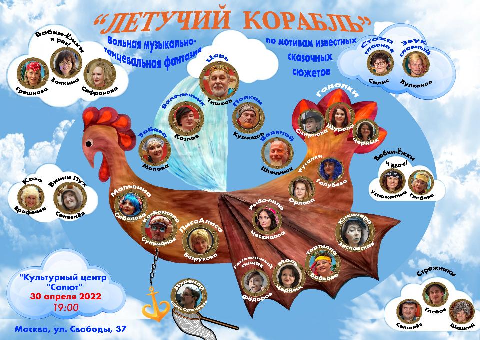 «Летучий корабль» — ретро-сказка и одновременно весёлое лекарство, созданное в «SILIS-театре» (г. Москва), дарит надежду всем возрастам. Звучит, танцует, зажигает.