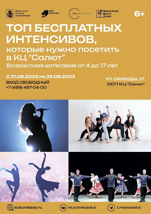С 20 по 25 августа в культурном центре "Салют" пройдет серия практических занятий. Ведущие – высокопрофессиональные руководители творческих коллективов и студий. С утра до вечера они будут рассказывать и демонстрировать свое мастерство по темам и направлениям, которые вас интересуют: вокал, хореография, классические и современные танцы.