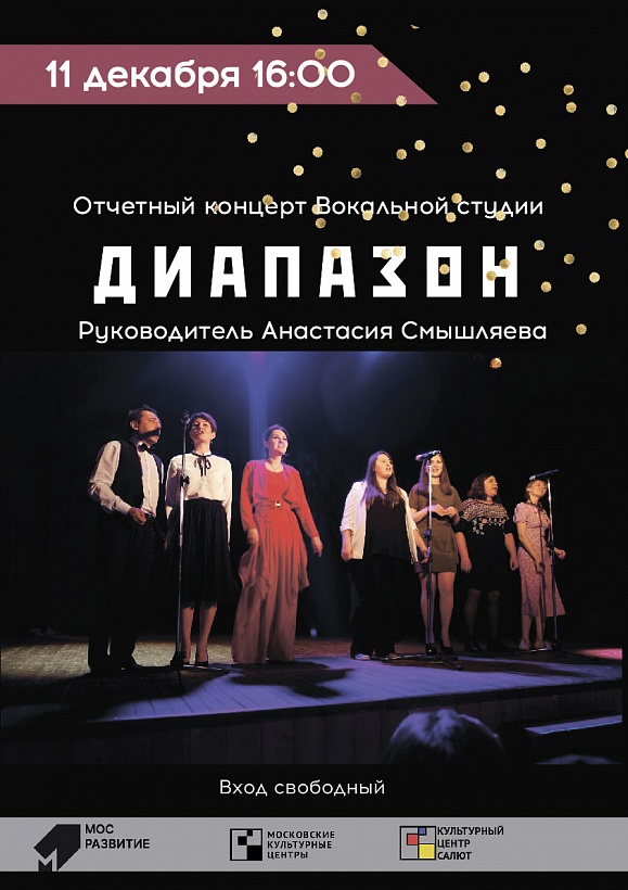 Отчетный концерт студии эстрадно-джазового вокала «Диапазон». Выступает взрослый состав нашего коллектива. В программе мероприятия будут исполнены сольные и коллективные номера. Участники продемонстрируют свои достижения за прошедший год. Выступлению на сцене предшествовали многодневные репетиции, и цена трудной, ежедневной работы - это ваши аплодисменты, зрители! Приглашаем гостей и желаем хорошего настроения от музыки и яркого исполнения вокалистами выбранных произведений!