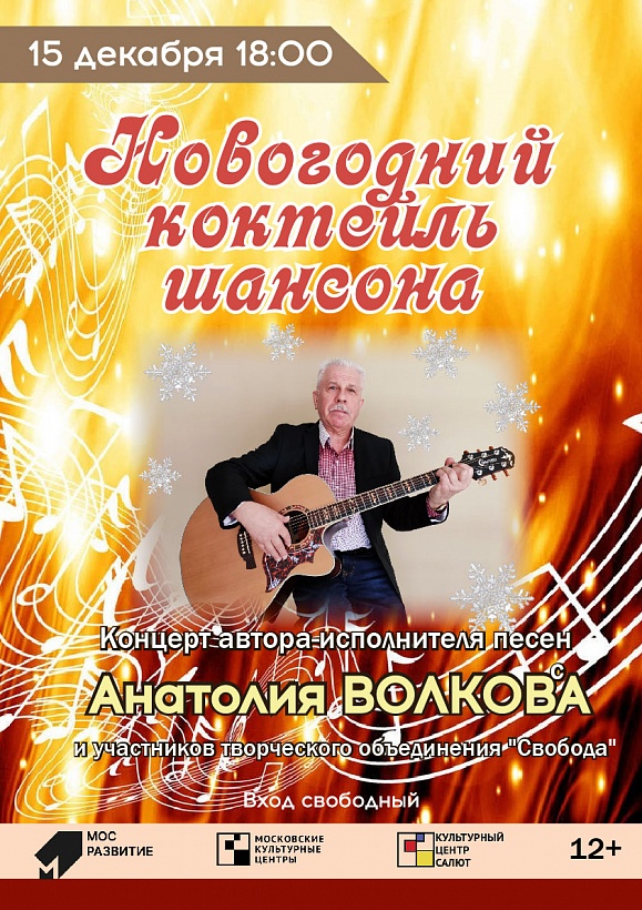 А шансон? Давайте попробуем его на вкус! Пусть в этот вечер песня будет как напиток, как коктейль, состоящий из изысканных ингредиентов, распробовав который хоть раз на вкус, уже не позабыть никогда! Зрителям Новогоднего концерта Анатолий Волков и участники объединения "Свобода", подарят незабываемое удовольствие от песен, собранных в музыкальный бокал Новогоднего коктейля шансона!