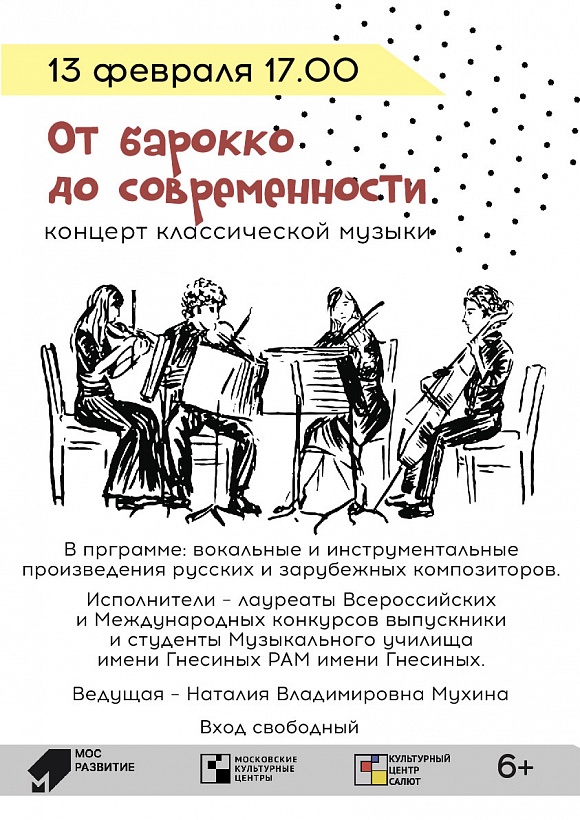 13 февраля в 17.00 состоится концерт классической музыки «От барокко до современности». Прозвучат вокальные и инструментальные произведения русских и зарубежных композиторов.