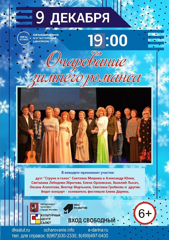 "Зимнее Очарование" - концерт авторской лирической песни и романса лауреатов Международного благотворительного фестиваля авторов современного русского романса и лирической песни "Очарование". В концерте принимают участие авторы: дуэт "Струна и голос" Светлана Мишина и Александр Юлин, Светалана Лебедева-Збратова, Елена Орловская, Василий Лысач, Оксана Агапитова, Виктор Мартынов, Светлана Грибкова и другие. Зрителей ждёт море светлых эмоций, красивейшие романсы и лирические песни современных авторов.