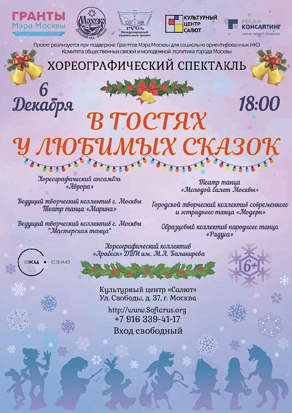 Учащиеся и педагоги хореографических коллективов представляют Музыкально-хореографическую постановку "В гостях у любимых сказок". Волшебные приключения, любимые герои, потрясающий язык танца, новогоднее настроение понравятся не только детям, но и взрослым.