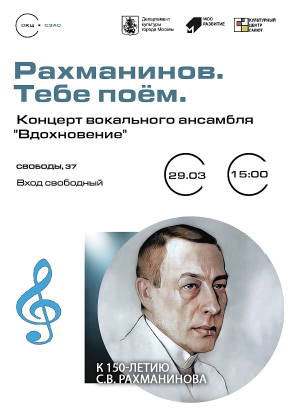 Приглашаем вас посетить концерт. Участники ансамбля исполнят арии из опер и романсы, среди которых "Сирень", своеобразная "визитная карточка" рахманиновской лирики, а также другие известные произведения: "Здесь хорошо", "В молчании ночи тайной", "Я жду тебя".