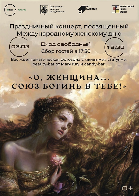 Сюжетная линия концерта будет развиваться не только динамично, но и с долей юмора: наши сценические богини, наделенные чертами и повадками современной женщины, спустятся с Олимпа, чтобы узнать, как почитают женщину в XXI веке. Действия на сцене будут сопровождаться яркими выступлениями артистов наших коллективов.