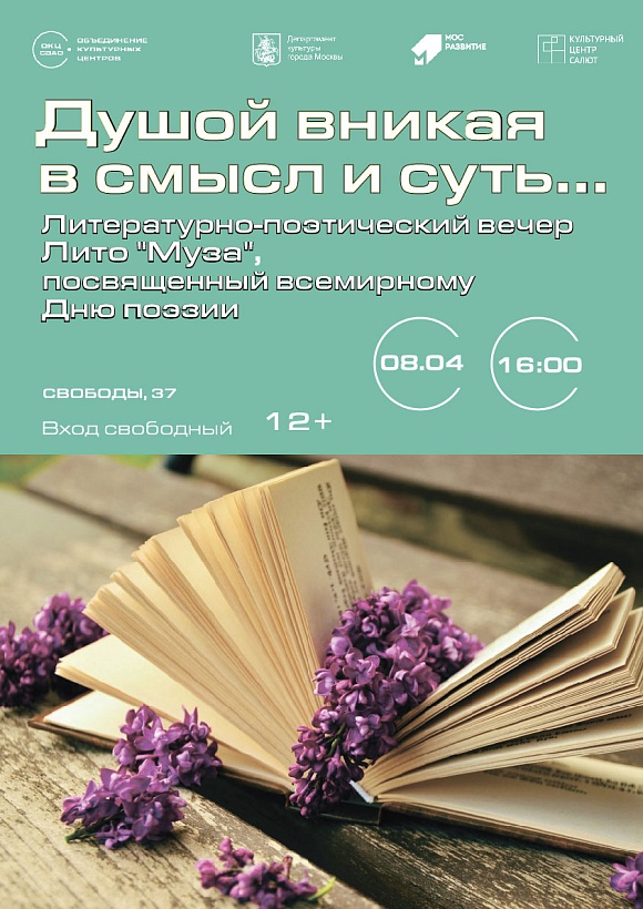 Поэты литературно-музыкального объединения "Муза" приглашают гостей на свой концерт, посвященный всемирному Дню поэзии. Они устроят своеобразный поединок, поэтический турнир, в котором сойдутся член Союза писателей России Юрий Мурашкин и опытный поэт Борис Линдин, Ольга Забелина, Валентин Петров, Светлана Катеринкина.
