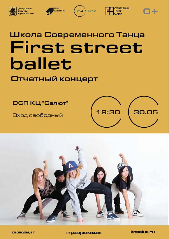 First Street Ballet славится самым разнообразным спектром направлений танцевального искусства. Это та школа, в которой из любителя сделают настоящего профессионала. Всё это танцоры покажут на концерте. В программе -номера и перфомансы в стилях современного танца: Contemporary dance, Modern-jazz dance, Hip-hop, Jazz funk, Folk dance, Vogue, Art dance.