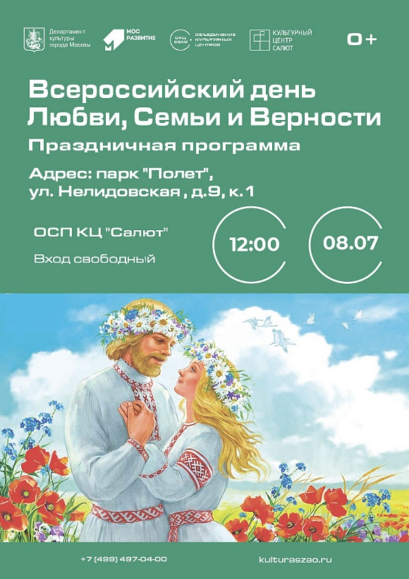 Уважаемые жители района Южное Тушино! 8 июля в 12.00 в парке "Полет" по адресу улица Нелидовская , д.9, к.1 пройдет праздничная программа к Всероссийскому дню семьи, любви и верности .