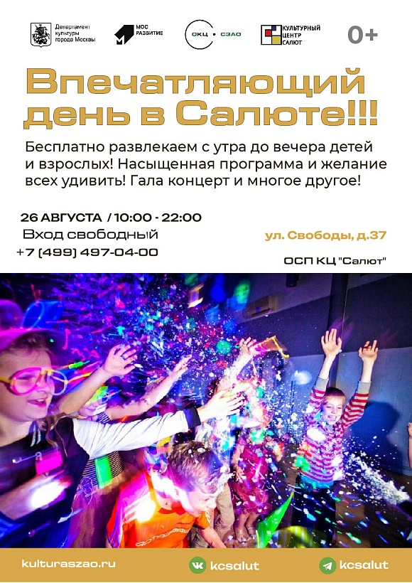 17:00 – 19:00 – Большой концерт участников творческих студий КЦ "Салют" "Лето. Салют. Таланты" (зал "Восход")