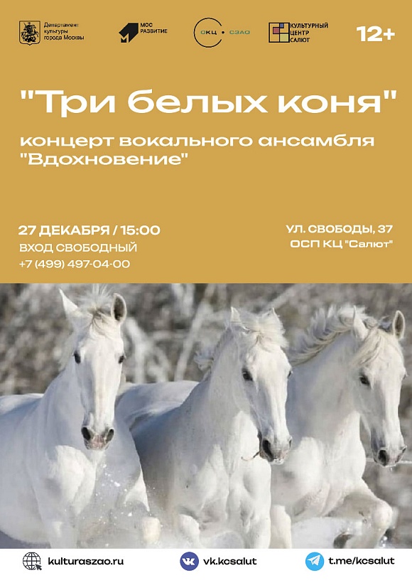 Когда снег приятно хрустит под ногами, а в воздухе уже витает ощущение приближающегося праздника, самое время посетить концерт вокального ансамбля "Вдохновение" "Три белых коня".