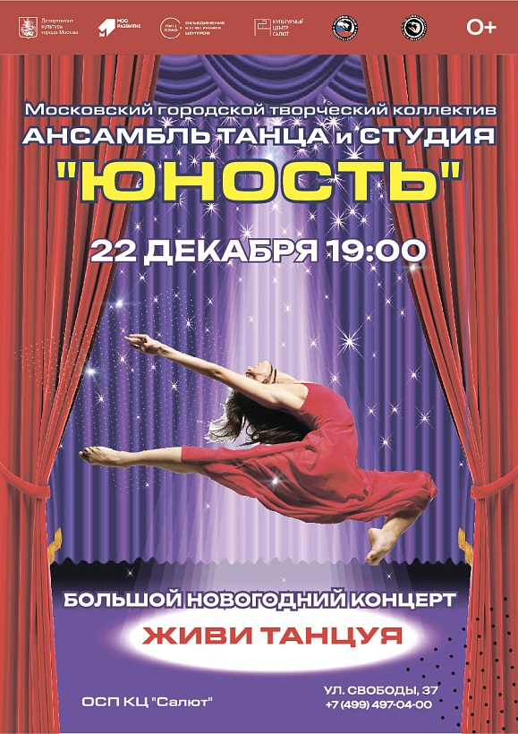 Мы рады пригласить вас на ежегодный концерт Московского городского творческого коллектива "Ансамбль танца "Юность" и Ведущего творческого коллектива г. Москвы "Студия хореографического мастерства "Юность", который состоится 22 декабря в 19:00 в Культурном центре "Салют".