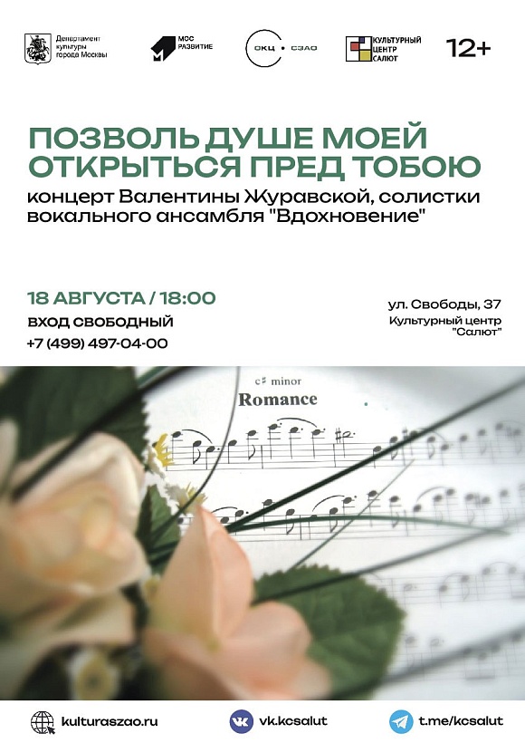 Приглашаем всех на концерт лауреата международных и всероссийских конкурсов ВАЛЕНТИНЫ ЖУРАВСКОЙ (сопрано), где прозвучат произведения русских композиторов XIX-XX вв. на стихи Александра Сергеевича Пушкина.