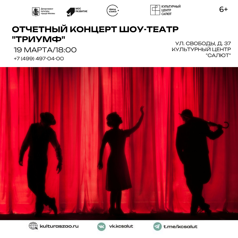 Провели с большим успехом отчетный концерт. Эстрадный шоу-театр "ТРИУМФ" — это одно из немногих мест, где дети, начиная с дошкольного возраста, могут одновременно заниматься и танцами, и вокалом, и актерским мастерством в одном месте, не выбирая между ними.Это очень важно, поскольку эстрада представляет совокупность этих трех направлений, и не достаточно просто делать движения в музыку и попадать в ноты, чтобы выступать на сцене. Всему этому здесь вас научат прекрасные педагоги, которые вкладывают в детей душу, стараются обучить каждого исполнять концертные номера. Им небезразлична судьба каждого ребенка. Сцена — прекрасный способ преодолеть застенчивость и смущение и раскрепоститься, и здесь детям дается такая возможность.