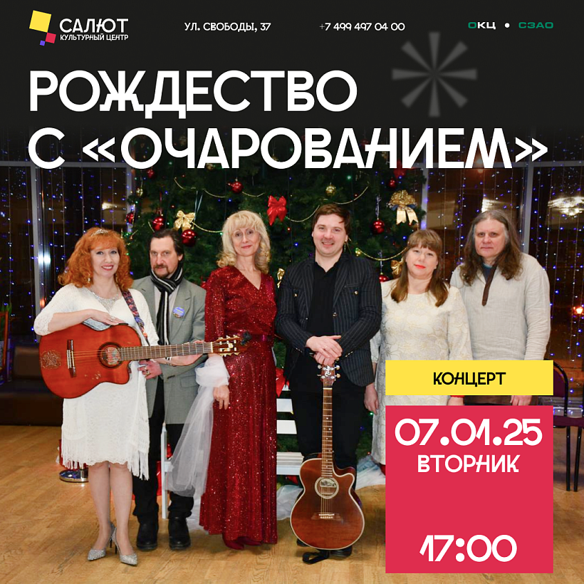 7 января в 17:00 приглашаем вас на Праздничный концерт "Рождество с Очарованием" от лауреатов Международного благотворительного фестиваля авторов современного русского романса и лирической песни "Очарование". В концерте принимают участие авторы-исполнители: Леонид Резник, Марина Шишкова-Волкова, Татьяна Ткаченко, Василий Лысач, Артем Белов, Елена Сугробова и Алексей Пронин и другие.
