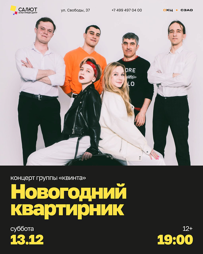 Концерт группы «КвинтА» в КЦ «Салют» 13.12.2025 19:00 Концерт группы «КвинтА» в КЦ «Салют» ! «КвинтА» в это не просто музыкальный коллектив, а целая творческая философия, в которой музыка становится способом объединить людей, подарить эмоции, вдохновить и… пуститься в танец! Вход по регистрации