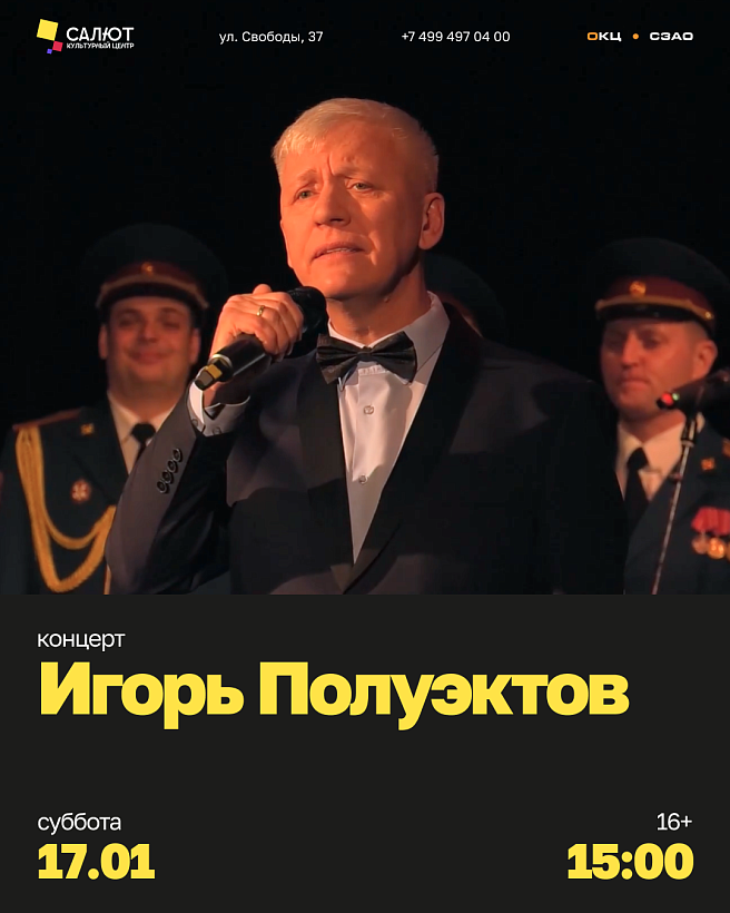 КЦ «Салют» приглашает вас на особенный музыкальный вечер - живой концерт Игоря Полуэктова, наполненный искренними чувствами, знакомыми мелодиями и настоящей душевной теплотой.