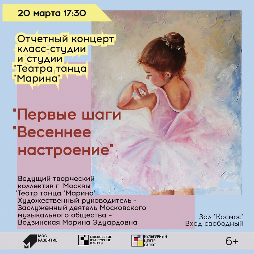 Это Отчетный концерт Класс-студии и студии «Марина». Принимают участие дети младшего дошкольного и среднего возраста. Программа концерта состоит из различных концертных номеров и хореографических миниатюр, подготовленных в этом творческом сезоне.