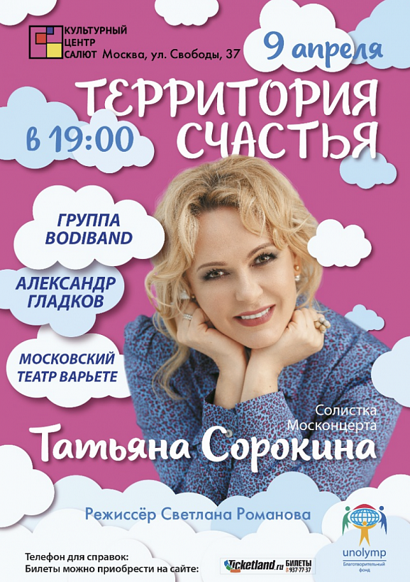 9 апреля мы ждём вас в лучшем месте Москвы – Культурном Центре Салют, где состоится долгожданный сольный концерт прекрасной певицы, Татьяны Сорокиной, занесённой в «Книгу рекордов России 2019» за вклад в искусство.