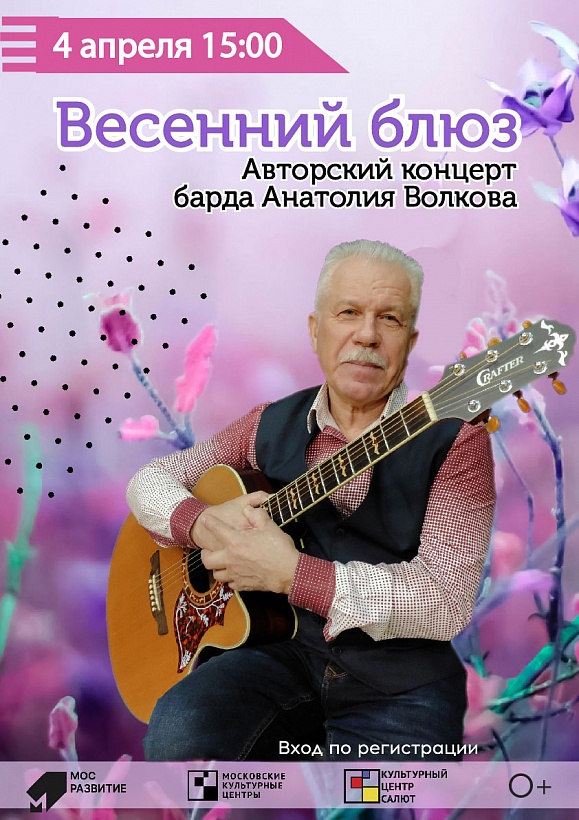 "Солнца весенний лучик утром заглянет в окно, свежесть лицо умоет ветром дыханье весны", - эти слова из песни Анатолия Волкова как нельзя лучше подходят к музыкальному представлению этого дня. На концерте прозвучат любимые песни автора, а также новые сочинения барда.