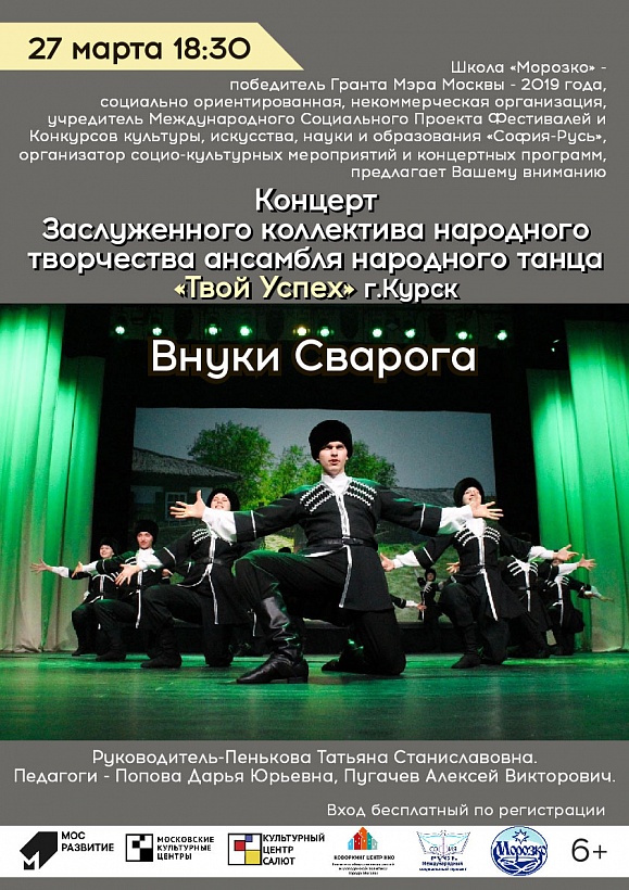 27 марта 2021 г. В КЦ «Салют» вы увидите яркое, динамичное и, как обычно, виртуозное вступление, которое представят зрителям Москвы молодые артисты нашего любимого коллектива «Твой успех» (г. Курск) с концертной программой «Внуки Сварога». Хореографический коллектив «Твой успех» - участник многочисленных концертных программ, фестивалей и конкурсов нашего Проекта «София-Русь», в том числе и Международной Программы «Дни русской культуры в странах Европы». С огромным успехом коллектив выступил на различных сценических площадках и концертных залах России, Белоруссии, Чехии, Германии, Испании.