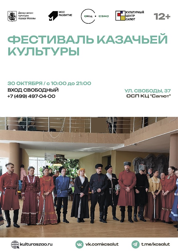 30 сентября с 10:00 до 21.00 в культурном центре "Салют" по адресу улица Свободы, 37 пройдет Фестиваль казачьей культуры.