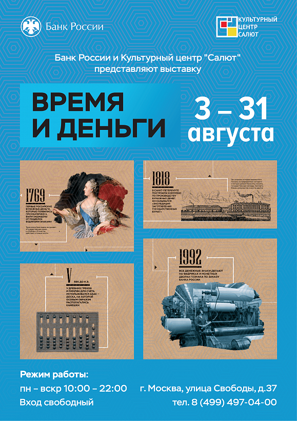С 3 по 31 августа 2021 года в Культурном центре «Салют» (Москва) будет работать выставка Банка России «Время и деньги».