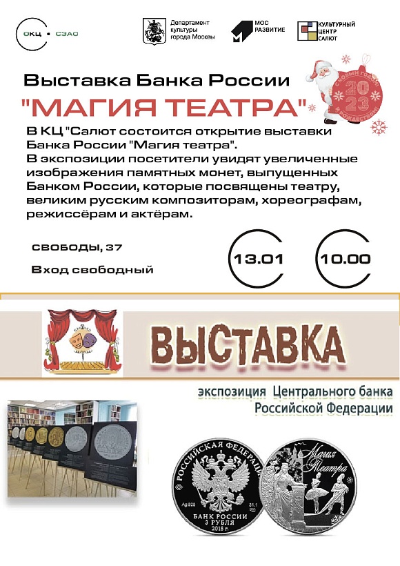 Уважаемые жители района Южное Тушино! 13 января в 10:00 в культурном центре "Салют" состоится открытие выставки Банка России "Магия театра". В экспозиции посетители увидят увеличенные изображения памятных монет, выпущенных Банком России, которые посвящены театру, великим русским композиторам, хореографам, режиссёрам и актёрам. Оригиналы этих монет можно увидеть в музее Банка России, есть они и у коллекционеров. Многие из «театральных» монет выполнены из драгоценных металлов – золота, серебра, платины и палладия. Такие изделия требуют особых условий хранения, поэтому организовать знакомство с ними за пределами музейных помещений возможно только в формате фотовыставки. Кроме того, этот формат даёт возможность рассмотреть все тонкости рисунка невооружённым глазом.