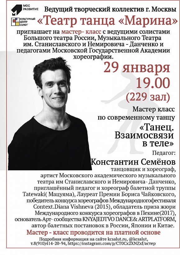Педагог : Танцовщик и хореограф, артист Московского академического музыкального театра им Станиславского и Немировича- Данченко,