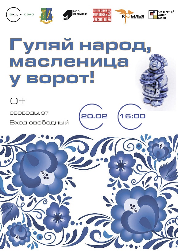 "Гуляй народ, масленица у ворот" 20.02.2023 16:00 В программе: праздничный концерт, народные гуляния, конкурсы с призами, чаепитие с блинами, мастер-классы для детей.
