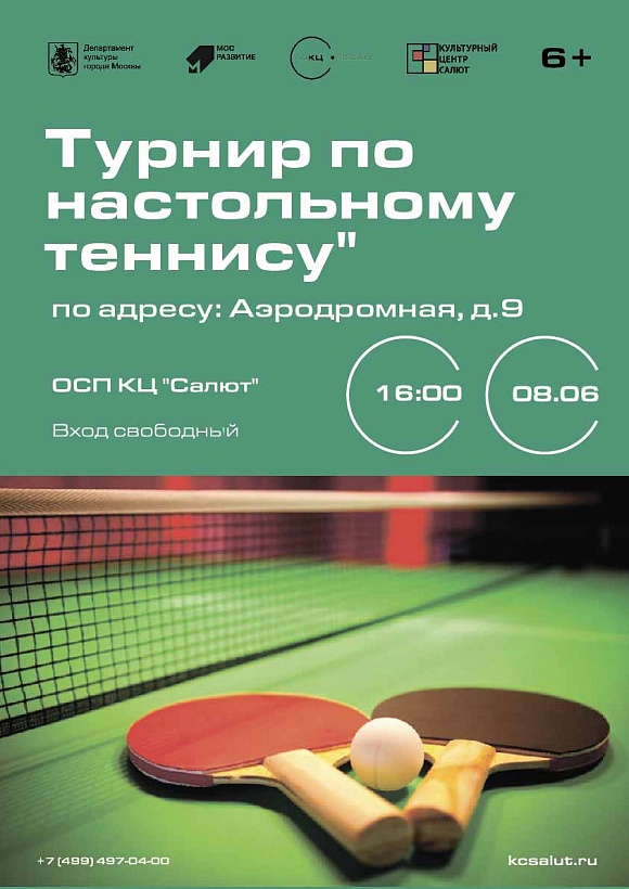 Яркое лето вместе с нами! 8 июня в 16:00 Культурный центр "Салют" проводит выездное мероприятие: турнир по настольному теннису. Турнир будет проходить в парке дубовая роща "Маяк". Ближайший адрес: Аэродромная улица, дом 9.
