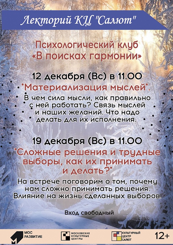 Психологический клуб «В поисках гармонии» 19.12.2021 11:00 Психологический клуб «В поисках гармонии» по воскресениям в 11:00 "Сложные решения и трудные выборы, как их принимать и делать?" На встрече поговорим о том, почему нам сложно принимать решения. Влияние на жизнь сделанных выборов.