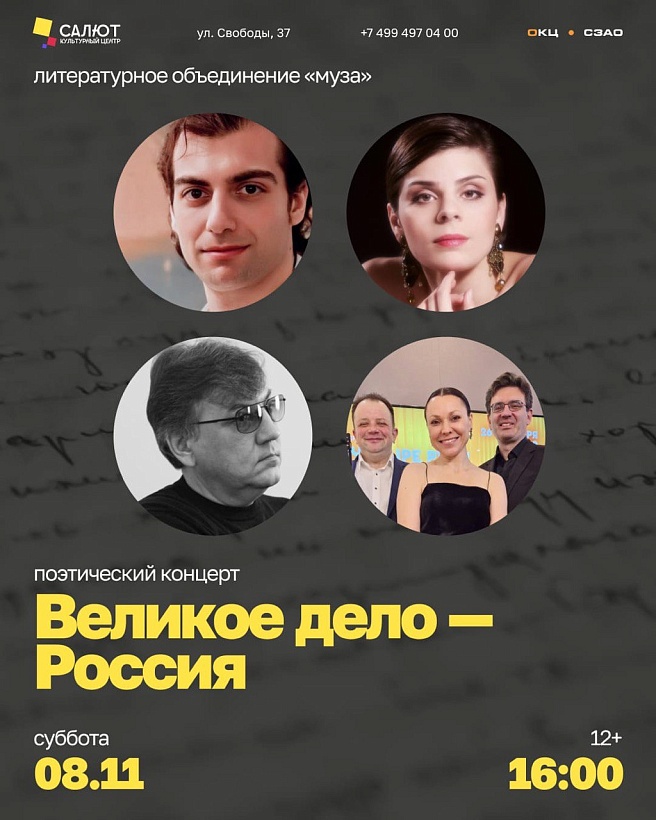 8 ноября в 16:00 в зале «Звезда» Культурного центра «Салют» (ул. Свободы, 37) состоится творческий вечер поэта Григория Вихрова «Великое дело — Россия».