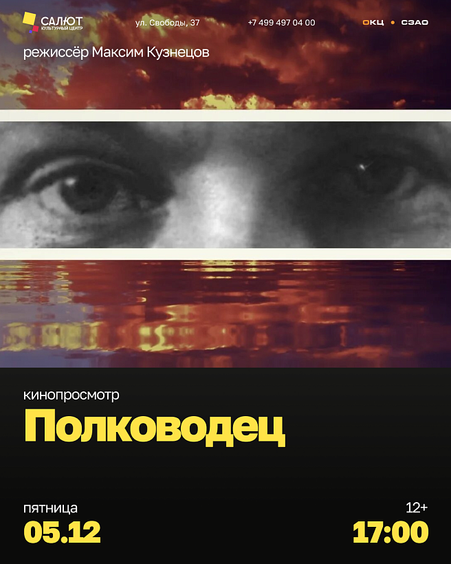 Показ фильма «Полководец» 05.12.2025 17:00 Приглашаем вас на показ короткометражного фильма, посвящённого одному из решающих этапов Великой Отечественной войны - Битве за Москву. Вход по регистрации (https://kulturnyy-tsentr-sa-event.timepad.ru/event/3692642/)
