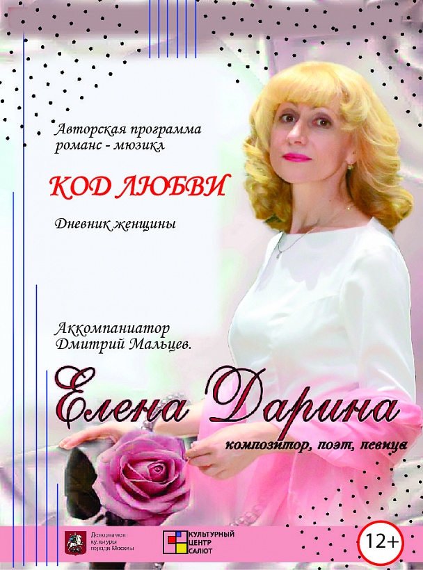 Песни и романсы из романс-мюзикла «Код любви» (дневник женщины) для Вас поет автор Елена Дарина. Вы услышите песни и стихи: «Под алым парусом», «Уезжаешь, работа, дела», «Прощание с летом», «Сдержанность», «Венок любви», «Нежнее нежного», «Я таю», «Кофе с дождем», «Красота», «Я камушек», «Прикосновение», «Окно приоткрыто».