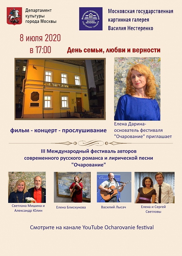 Приглашаем зрителей, 8 июля в 17:00, на видео-концерт фестиваля «Очарование» в День семьи, любви и верности на канале https://www.youtube.com/c/Ocharovaniefestival