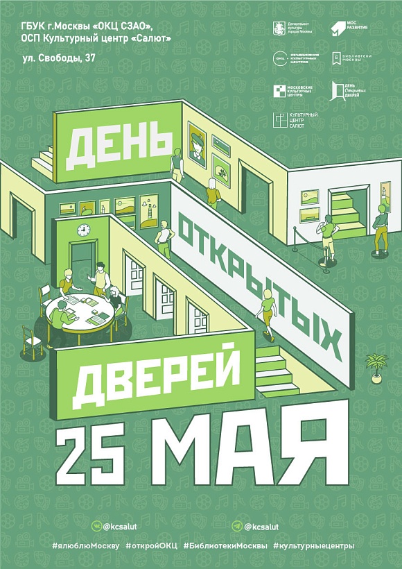 25 мая с 10:00 до 20:00 в культурном Центре "Салют" пройдет единая городская акция "День открытых дверей". Мы приглашаем всех желающих прийти на территорию, где царит свобода, творчество, самовыражение!