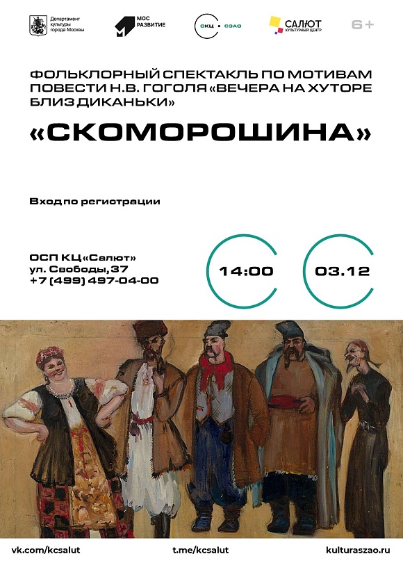 В Культурном центре "Салют" состоялся фольклорный спектакль по мотивам повести Н.В. Гоголя "Вечера на хуторе близ Диканьки", в котором неповторимый колорит Малороссии нашел свое отражение, как в прозе, так и в стихах, и согрел вас ощущением праздника. Старинные гадания, колядки и сказочная атмосфера спектакля не оставили равнодушными ни ребёнка, ни взрослого! Сама встреча с кузнецом Вакулой и прекрасной Оксаной, Чубом и Паном Головой, Дьяком и Солохой была поистине волшебной. Шутки и скоморошьи прибаутки заставили смеяться, а черти и ведьмы окунули в мир волшебства. "Вечера близ Диканьки - изумляют. Вот настоящая весёлость, искренняя, непринуждённая, без жеманства, без чопорности. А местами какая поэзия!.. Всё это так необыкновенно в нашей нынешней литературе, что я доселе не образумился…"