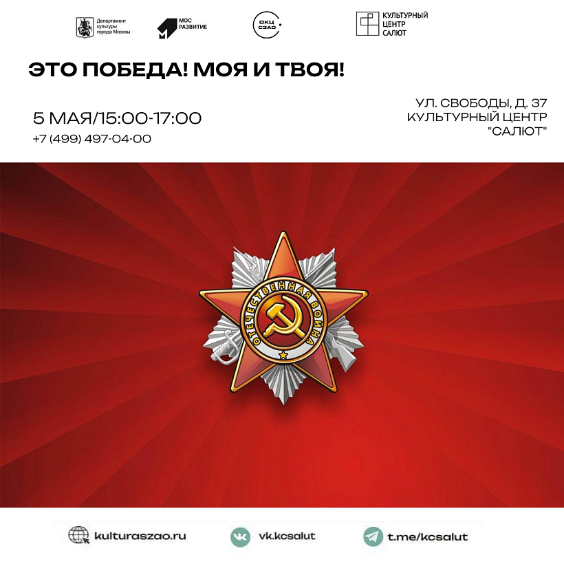 В Культурном центре "Салют" прошел праздничный концерт, организованный управой Южное Тушино, для ветеранов нашего района. В наше время особенно важно знать и помнить подвиги Отечественных героев. В эти праздничные дни мы проявляем особое внимание к ветеранам, это Победа! Моя и твоя! Победа нашего Отечества!