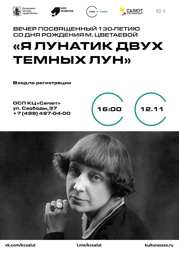 "Я лунатик двух темных лун" - вечер посвященный 130-летию со дня рождения М. Цветаевой 12.11.2022 16:00