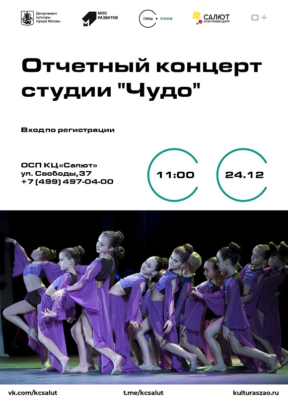 Отчетный концерт студии "Чудо"- Это та школа, в которой из любителя сделают настоящего профессионала.Всё это танцоры покажут на концерте. В программе -номера и перфомансы в стилях современного танца: