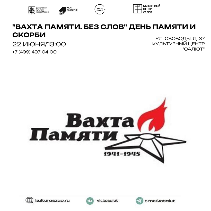 "Вахта памяти. Без слов" День памяти и скорби 22.06.2023 13:00 Приняли участие в "Вахте памяти. Без слов". Выездное мероприятие сопроводилось возложением цветов и венков к памятникам в честь ВОВ, установленным в СЗАО.