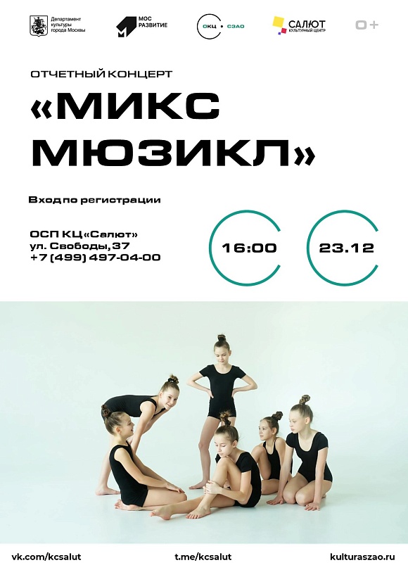 Отчетный концерт "Микс Мюзикл" 23.12.2022 16:00 Отчетный концерт студии "Микс Мюзикл"- школа, в которой из любителя сделают настоящего профессионала.Всё это танцоры покажут на концерте. В программе -номера и перфомансы в стилях современного танца:
