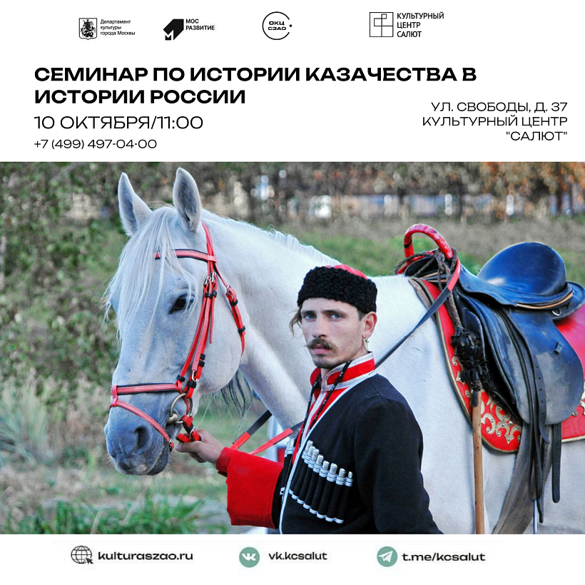 Самая увлекательная лекция состоялась в Культурном центре "Салют", посвященная истории Казачества в истории России. Для жителей Северо-Западного административного округа города Москвы на этом интереснейшем лектории были подробно рассказаны и раскрыты важные этапы развития казачества, начиная с его происхождения и до современных времен, исторические факты и,конечно же, легенды.