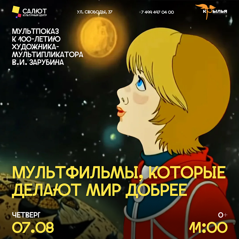 Мультпоказ "Мультфильмы, которые делают мир добрее" 07.08.2025 11:00 Мультпоказ к 100-летию художника-мультипликатора В.И. Зарубина Зал «Космос»
