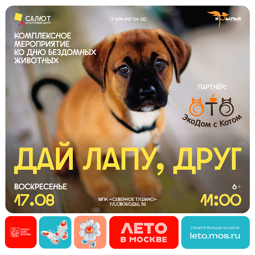 День бездомных животных. Уникальный проект социо-культурной направленности. Он направлен на решение проблемы жестокого обращения с животными и на регресс проблемы безнадзорных животных. Главной особенностью фестиваля станет то, что посетителями будут не только люди, но и их усатые друзья. На площадке пройдёт серия лекций на темы об уходе, заботе о кошках и др., где каждый посетитель сможет задать вопросы, касающиеся конкретно их питомца.