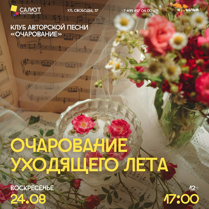 Концерт "Очарование уходящего лета" 24.08.2025 17:00 Концерт клуба авторской песни "Очарование". Зал "Космос"