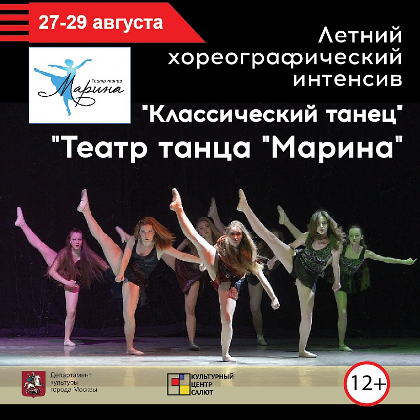 Танцевальный курс от Ведущего творческого коллектива города Москвы "Театр танца "Марина". Программа интенсива: экзерсис у станка, экзерсис на середине, аллегро (прыжки), пальцевая техника.