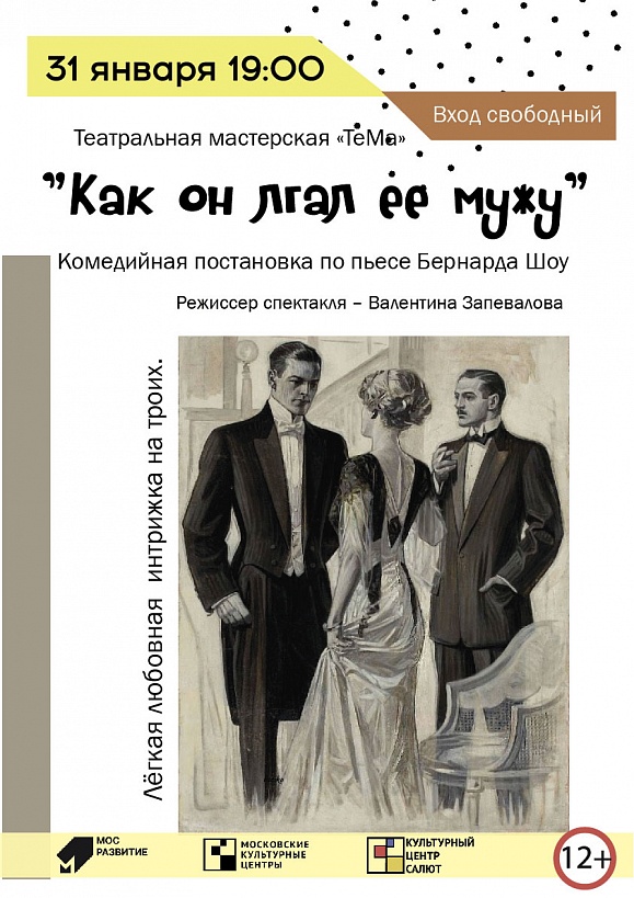 Театральная мастерская "ТеМа" представляет зрителю свою новую комедийную постановку по пьесе Бернарда Шоу "Как он лгал её мужу".