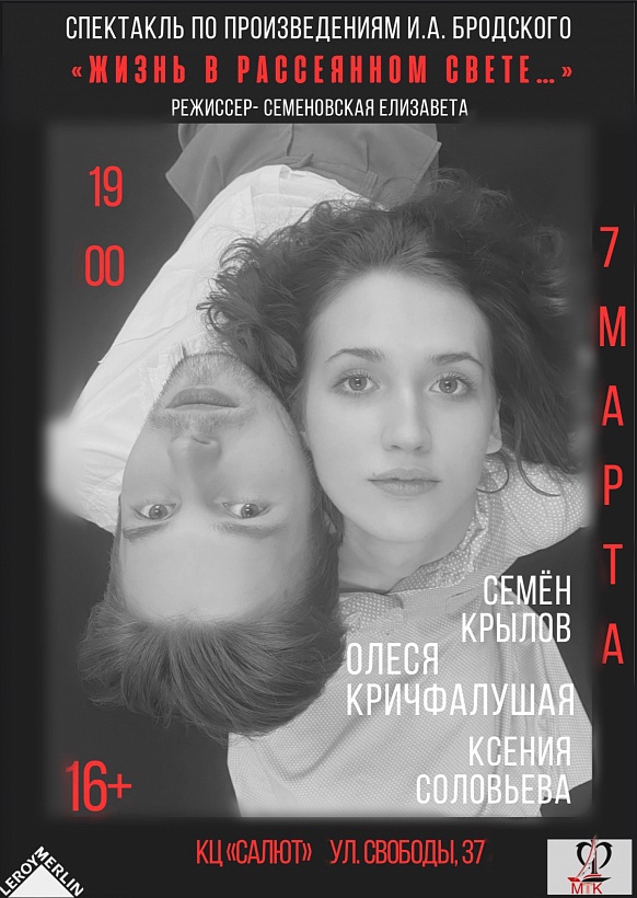 В основе концепции мероприятия лежат произведения Иосифа Бродского и поднимается проблема одиночества гениального человека. В первой части мероприятия зрителям в фойе будет представлена выставка, которая подробно ознакомит гостей с биографией Бродского. На выставке будут представлены документы, фотографии и сборники поэта. Затем зрителя пригласят на литературно-пластическую композицию "Жизнь в рассеянном свете", в процессе которой перед зрителем и героями встанет вопрос выбора между творческой самореализацией и человеческим счастьем в любви.